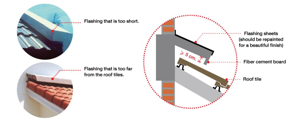 Untuk kebocoran atap yang terjadi pada lembar-lindung beton-tulang, retakan dapat diperbaiki dengan memotong dan menutupnya dengan semen untuk memperbaiki struktur. Disarankan juga untuk melepas lembar-lindung dan mengganti dengan sistem pemasangan atap (pilih model yang dibuat khusus untuk genteng yang dipilih). Selain itu, jika lembar-lindung di bawah standar, meskipun tidak retak lembar-lindung juga bisa mengalami kebocoran yang seharusnya tidak diperbaiki dengan menggunakan semen. Jika lembar-lindung terlalu pendek, disarankan untuk menghancurkan dan membuat lembar-lindung yang baru. Namun, jika lembar-lindung terlalu tinggi di atas atap (tidak lebih dari 5 cm.), ketebalan lembar-lindung sebaiknya ditingkatkan dengan demarkasi dan plesteran. Jika lembar-lindung lebih dari 5 cm, ketebalan lembar-lindung perlu ditambahkan, instal bahan lain seperti papan serat semen pada ujung lembar-lindung. Ini dapat membantu mengurangi celah antara ubin atap dan lembar-lindung. Selain itu, segel dapat ditutup dengan lembaran kaca dan dicat untuk hasil akhir yang indah.