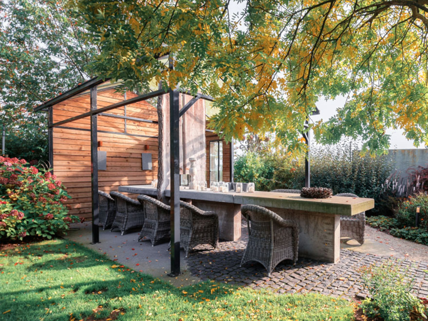 Gazebo ini dibuat untuk melengkapi penampilan dari sebuah rumah. Tentunya, pembuatannya disesuaikan dengan gaya rumah minimalis modern. Ciri khas gazebo ini adalah pemanfaatan elemen kayu. Kemudian, aksen garis tegas dari gazebo dikuatkan. Hanya saja, areanya memang sengaja dibuat lebih terbuka dengan atap berbahan kayu yang lebih simpel.