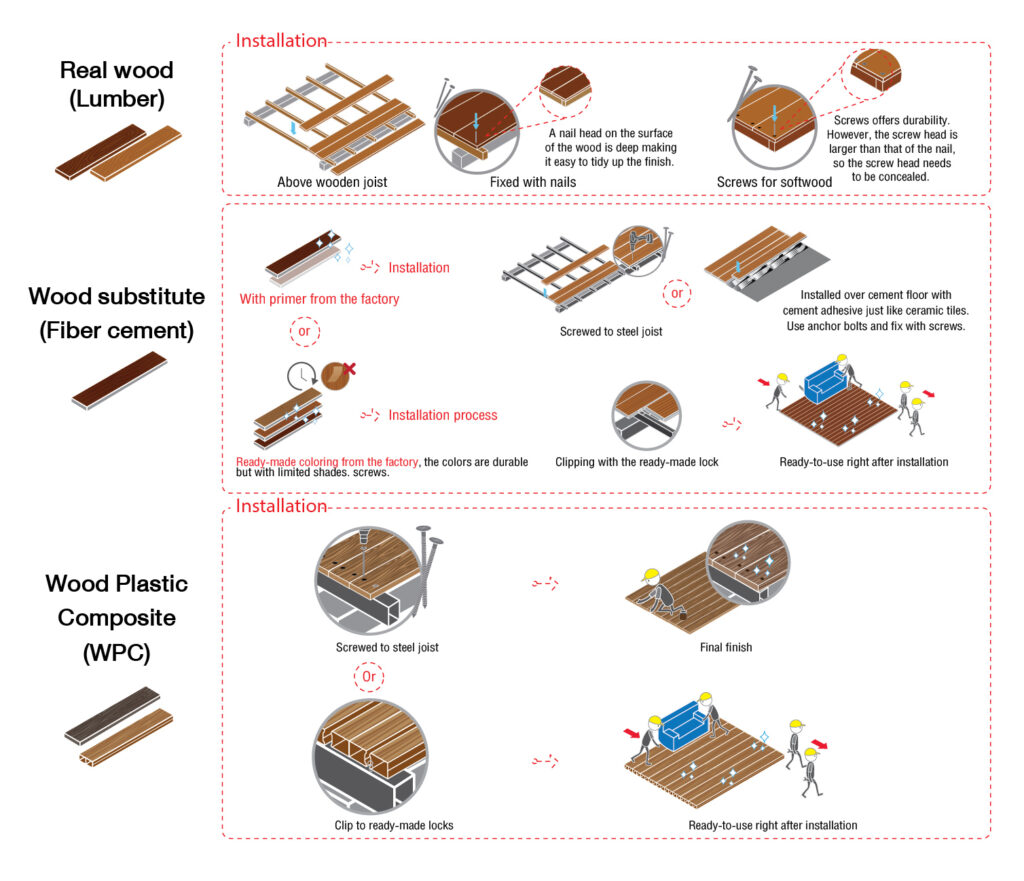 Ragam Instalasi untuk kayu asli, Pengganti kayu serat semen, dan WPC.
